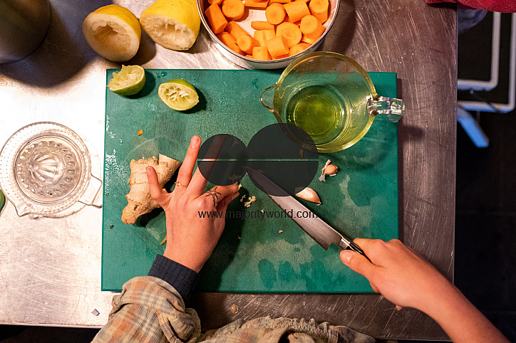 Families cooking at eating healthy, herbal and nutritious food at the eco-village of Loural in the mountains of central Portugal. Here, the Klein family and their partners have been working on an ambitious project to rehabilitate a small village that has been abandoned since the year 2000 into an eco-location. On 30 hectares, the aim is to improve the ecosystem by practicing organic agriculture, reforestation and the production of green energy. The small stone village is moving towards food and energy autonomy and its vegetation is gradually coming back to life. The place is starting to provide integrative health training and artistic activities, its final vocation. Loural, Coimbra region, Portugal.