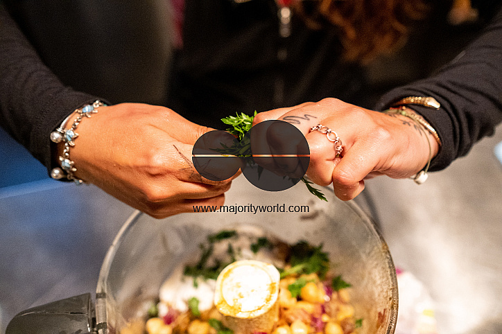 Families cooking at eating healthy, herbal and nutritious food at the eco-village of Loural in the mountains of central Portugal. Here, the Klein family and their partners have been working on an ambitious project to rehabilitate a small village that has been abandoned since the year 2000 into an eco-location. On 30 hectares, the aim is to improve the ecosystem by practicing organic agriculture, reforestation and the production of green energy. The small stone village is moving towards food and energy autonomy and its vegetation is gradually coming back to life. The place is starting to provide integrative health training and artistic activities, its final vocation. Loural, Coimbra region, Portugal.