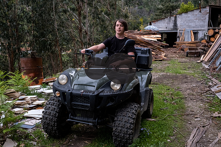 People involved in carpentry work at the eco-village of Loural in the mountains of central Portugal. Here, the Klein family and their partners have been working on an ambitious project to rehabilitate a small village that has been abandoned since the year 2000 into an eco-location. On 30 hectares, the aim is to improve the ecosystem by practicing organic agriculture, reforestation and the production of green energy. The small stone village is moving towards food and energy autonomy and its vegetation is gradually coming back to life. The place is starting to provide integrative health training and artistic activities, its final vocation. Loural, Coimbra region, Portugal.