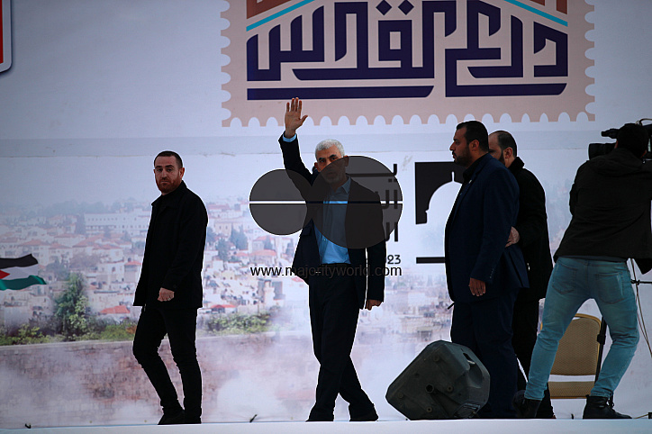 Yahia al-Sinwar (C), the Gaza Strip chief of the Palestinian Islamist Hamas movement, greets a supporter as he arrives to attend a rally marking Al-Quds (Jerusalem) Day, a commemorative day in support of the Palestinian people celebrated annually on the last Friday of the Muslim fasting month of Ramadan by an initiative started by the late founder of the Islamic republic in Iran. Gaza City. Palestine.