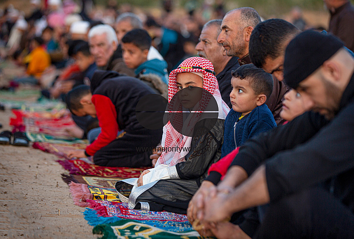 Palestinians perform Eid al-Fitr prayers at sunrise in Khan Yunis in the southern Gaza Strip. Eid al-Fitr, which marks the end of the holy month of Ramadan, is celebrated by all Muslims around the world. Gaza City. Palestine.