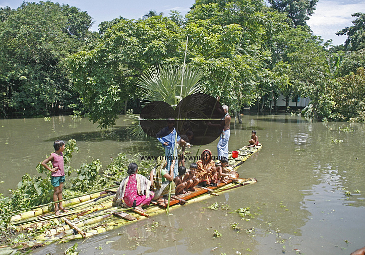 Flood affected people using banana raft to go from one place to another, at the village of Sibaloy, in Manikganj, Bangladesh. August 2, 2007.
