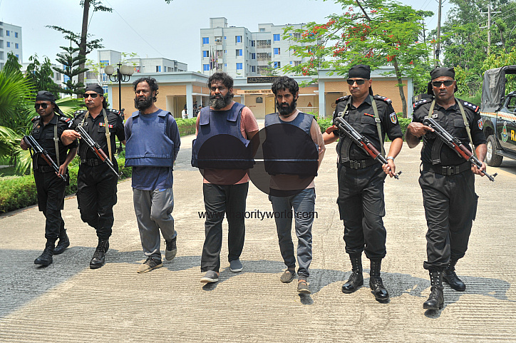 The Rapid Action Battalion (RAB) has arrested four dangerous terrorists from Barashala area of Sylhet airport. All those arrested are members of the militant new organization 'Jamatul Ansar Fil Hindal Sharqiya'. Abdullah Maymoon, Shura member of 'Jamatul Ansar Fil Hindal Sharqiya' and head of Dawati branch, is among the four arrested. Sylhet, Bangladesh.
