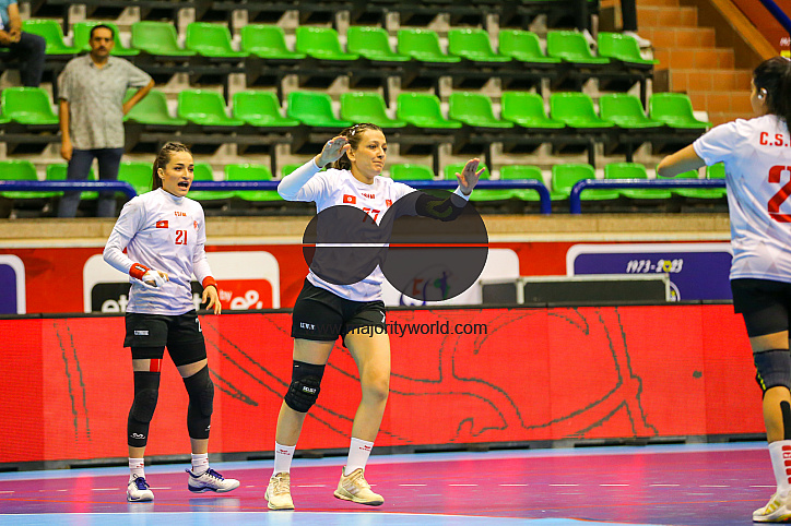 Amiche Boutheina and Hachana Sondes 21 of Moknine during the 2023 women African Handball confederation match between Al Ahly Dames and Moknine of Tunisia in Cairo, Egypt.