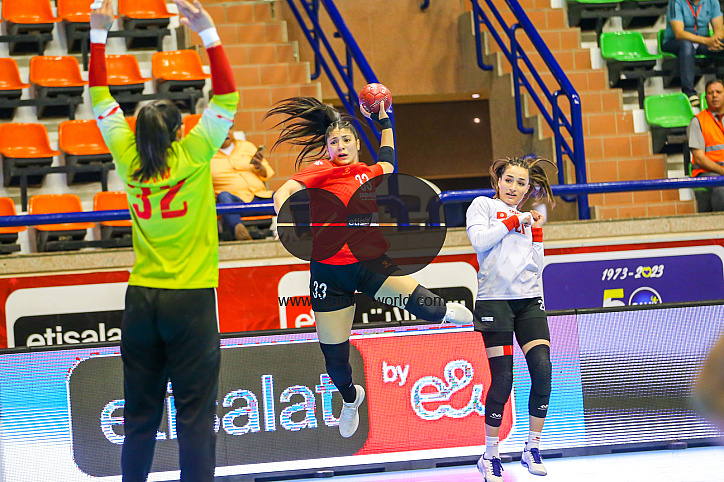 Amina Atef Haggag of Al Ahly and Moknine defenders during the 2023 women African Handball confederation match between Al Ahly Dames and Moknine of Tunisia in Cairo, Egypt.