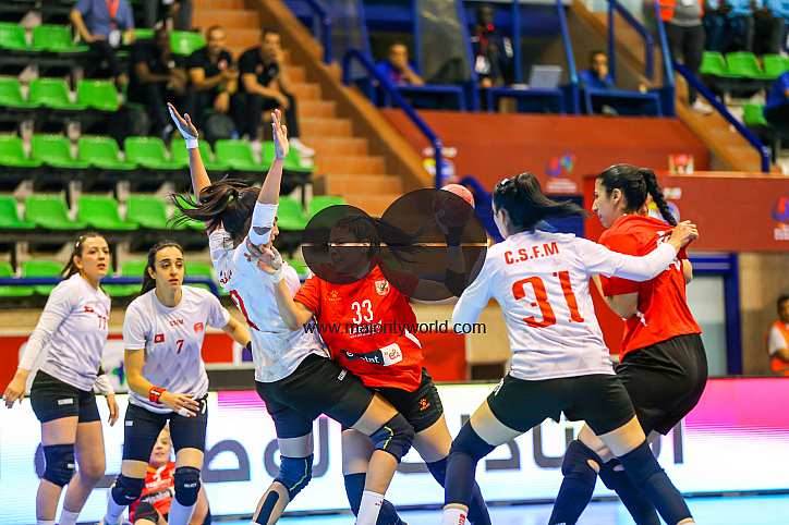 Amina Atef Haggag of Al Ahly and Moknine defenders during the 2023 women African Handball confederation match between Al Ahly Dames and Moknine of Tunisia in Cairo, Egypt.