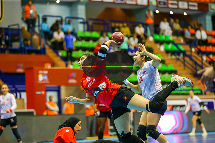 Sara Hossam Elkholv of Al Ahly and Hassine Sarra of Moknine during the 2023 women African Handball confederation match between Al Ahly Dames and Moknine of Tunisia in Cairo, Egypt.