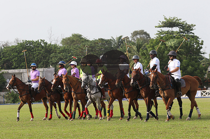 • Description: Polo players compete for the ball during the Ladies Polo invitation tournament between Team White vs Team Purple, at the Lagos polo club, Ikoyi, Lagos, Nigeria.