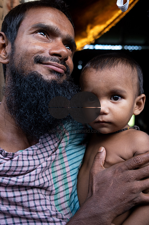 Portrait of bangladeshi fatherand child. The slum of Duari Para in Dhaka, the capital of Bangladesh, home to mainly climate migrants from the southern countryside where they have suffered the effects of climate change: rising water levels, soil erosion an