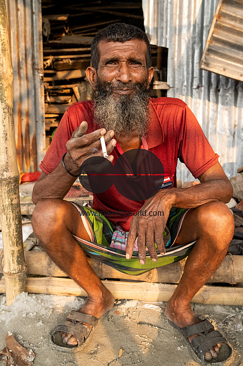 Portrait of a Bangladeshi man smocking a ciggerate. Pratab Nagar village is severely affected by climate change, including rising water levels, erosion and salinisation. Satkhira Province, Bangladesh.
