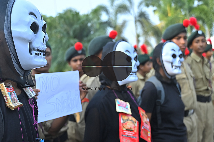 • Image Description: NCC cadets (National Cadet Corps) wear facemasks during an anti-tobacco street drama on 'World No Tobacco Day,' at Agartala. Tripura, India.