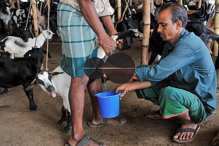 A trader is collecting milk from his Goats at the Kazir Bazar market. Livestock from different parts of the country are on sale at the Kazir Bazar livestock market ahead of the upcoming Eid-ul-Adha Festival. Sylhet, Bangladesh.