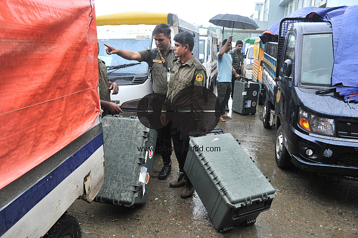 • Description: Sylhet, Bangladesh. 20th June 2023. Amid heavy rainfall, EVM machines are being sent to the polling stations from the AMA Muhith Sports Complex ahead of Sylhet City Corporation Polls slated for June 21st 2023.