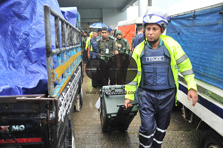 • Description: Sylhet, Bangladesh. 20th June 2023. Amid heavy rainfall, EVM machines are being sent to the polling stations from the AMA Muhith Sports Complex ahead of Sylhet City Corporation Polls slated for June 21st 2023.