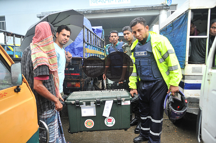 • Description: Sylhet, Bangladesh. 20th June 2023. Amid heavy rainfall, EVM machines are being sent to the polling stations from the AMA Muhith Sports Complex ahead of Sylhet City Corporation Polls slated for June 21st 2023.