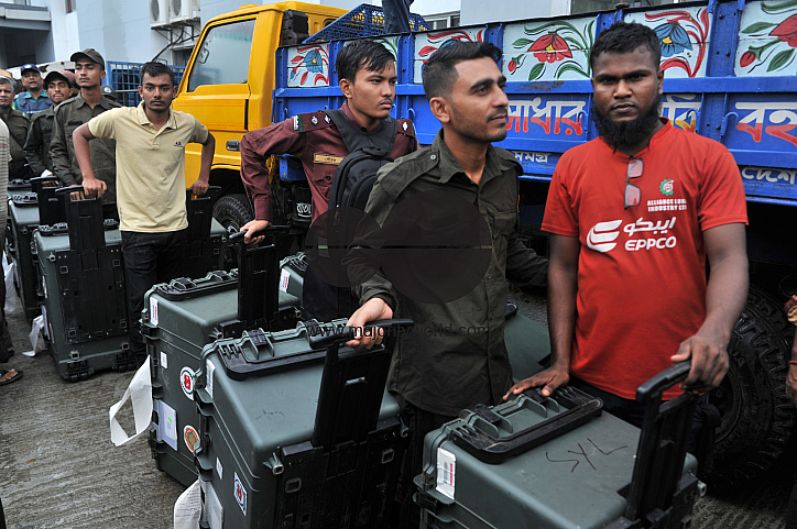 • Description: Sylhet, Bangladesh. 20th June 2023. Amid heavy rainfall, EVM machines are being sent to the polling stations from the AMA Muhith Sports Complex ahead of Sylhet City Corporation Polls slated for June 21st 2023.
