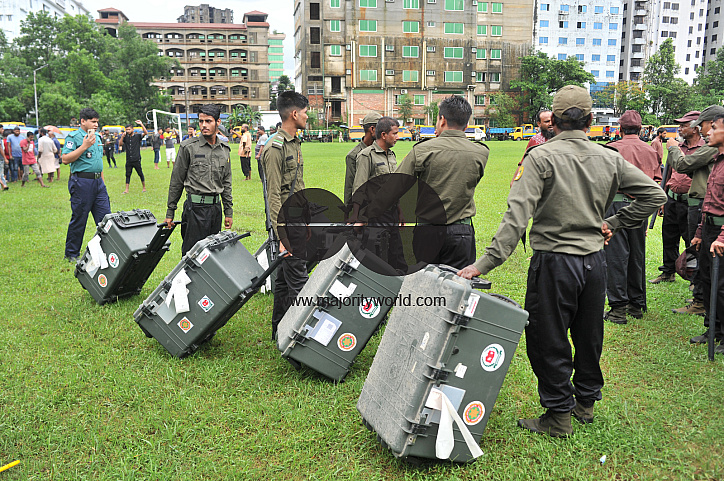 • Description: Sylhet, Bangladesh. 20th June 2023. Amid heavy rainfall, EVM machines are being sent to the polling stations from the AMA Muhith Sports Complex ahead of Sylhet City Corporation Polls slated for June 21st 2023.