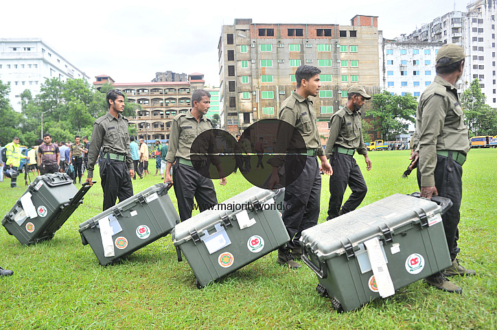 Sylhet, Bangladesh. 20th June 2023. Amid heavy rainfall, EVM machines are being sent to the polling stations from the AMA Muhith Sports Complex ahead of Sylhet City Corporation Polls slated for June 21st 2023.