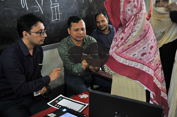 • Description: Sylhet, Bangladesh. 21st June 2023. Thousands of voters came to the polling station of Rashidiya Dakhil Madrasa, word number 38, which was newly added to Sylhet City Corporation. People thronged the polling stations spontaneously but the slowness of EVMs disappointed them. Meanwhile, Ansar members are standing in line and showing how to vote at EVM machines.