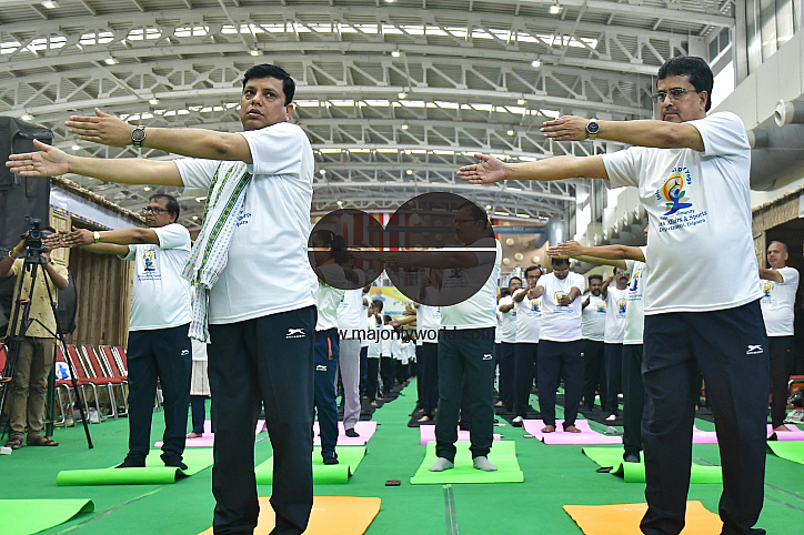 • Image Description: Tripura CM Manik Saha, along with other ministers, government officials and students perform yoga on International Day of Yoga in Agartala. Tripura, India.