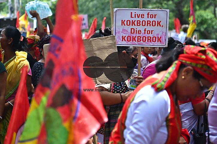 • Image Description: The members of the women''s wings of ' 'TIPRA Motha'', in a massive demonstration called, "Raj Bhavan Abhiyan", demanded the adoption of the Roman script for Kokborok language, at Agartala. Tripura, India.