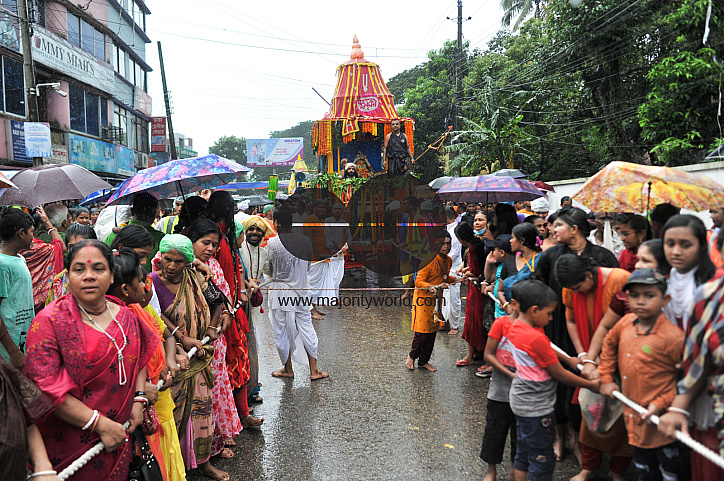 Devotees take part with a colorful Ratha Cart at the Reverse Ratha Yatra Festival while its raining at Rikabibazar point of Sylhet, Bangladesh.