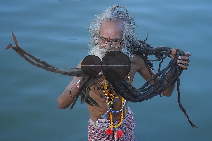 A holy man is seen taking a bath early morning before the start of the tribal festival "Kharchi Puja ''. Fourteen head idols, made of silver and brass, are worshiped in the seven-day long "Kharchi Puja'', the biggest religious festival of tribal Hindus in