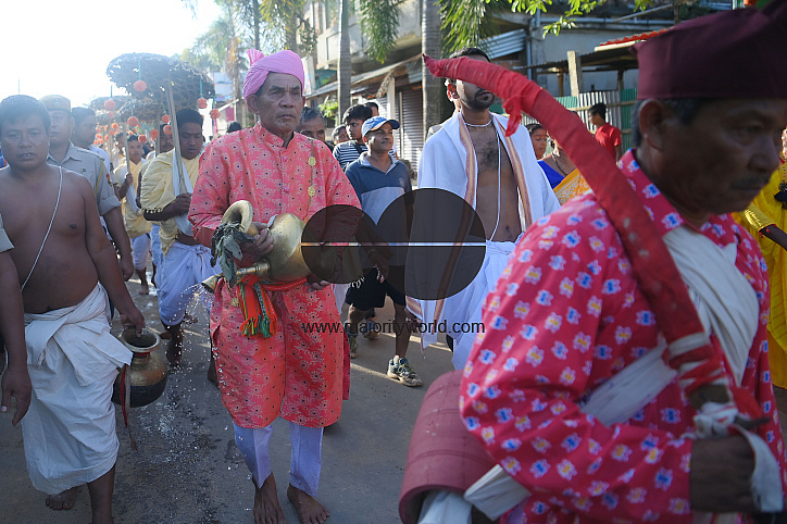 • Image Description: Tribal Priests carrying idoles of "Kharchi" Gods, perform "Kharchi Puja", and worship rituals. Fourteen head idols, made of silver and brass, are worshiped in the seven-day long "Kharchi Puja", the biggest religious festival of tribal Hindus in the Tripur