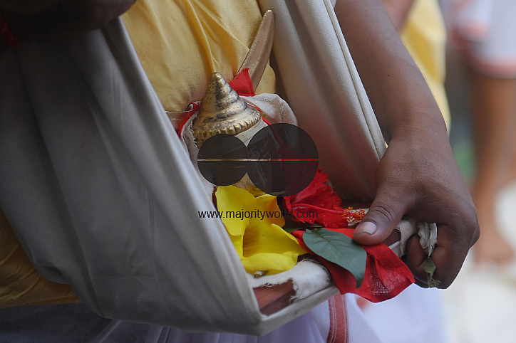 • Description: Tribal Priests carrying idoles of "Kharchi" Gods, perform "Kharchi Puja", and worship rituals. Fourteen head idols, made of silver and brass, are worshiped in the seven-day long "Kharchi Puja", the biggest religious festival of tribal Hindus in the Tripura state. Agartala, India.