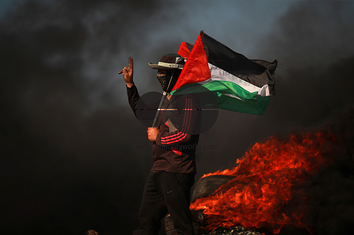 • Description: Palestinian youth hold flags next to burning tyres during a protest by the border fence with Israel east of Gaza City. Israel has stepped up operations in the northern West Bank, home to Jenin city and its adjacent refugee camp. Gaza City, Palestine.