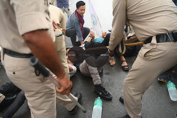 • Image Description: The members and supporters of the TSF (Twipra Students Federation) are protesting and demanding the introduction of Kokborok in Roman Script and passage of the 125th Constitutional Amendment Bill during their statewide 12-hour strike in Agartala. Tripura,