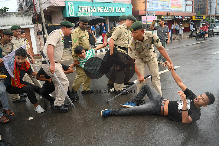 • Description: The members and supporters of the TSF (Twipra Students Federation) are protesting and demanding the introduction of Kokborok in Roman Script and passage of the 125th Constitutional Amendment Bill during their statewide 12-hour strike in Agartala. Tripura, India.