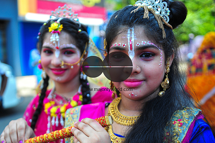 • Description: Young girls dress up as Radha and Krishna during the colorful rally of the Krishna Janmashtami event celebrated by Hindu devotees to mark the birth anniversary of Lord Krishna who is believed to be the eighth avatar or incarnation of Lord Vishnu. Sylhet, Bangladesh.