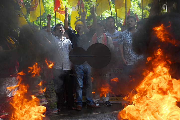 • Image Description: The ‘Tipraha Indigenous Progressive Regional Alliance (TIPRA)’’ supporters raise slogans demanding a separate Greater Tipraland state for tribals, in Bermuda Ashram Para. Agratala. Tripura, India.