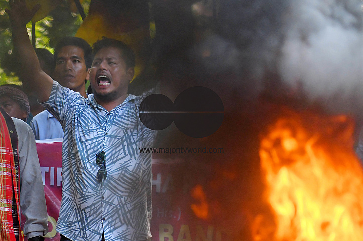 • Image Description: The ‘Tipraha Indigenous Progressive Regional Alliance (TIPRA)’’ supporters raise slogans demanding a separate Greater Tipraland state for tribals, in Bermuda Ashram Para. Agratala. Tripura, India.