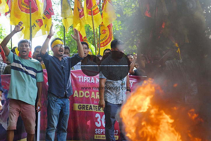 • Image Description: The ‘Tipraha Indigenous Progressive Regional Alliance (TIPRA)’’ supporters raise slogans demanding a separate Greater Tipraland state for tribals, in Bermuda Ashram Para. Agratala. Tripura, India.