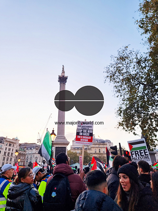 Thousands of protestors raise voices, carry placards and show their support for Palestinians, at Trafalgar Square, central London. United Kingdom.
