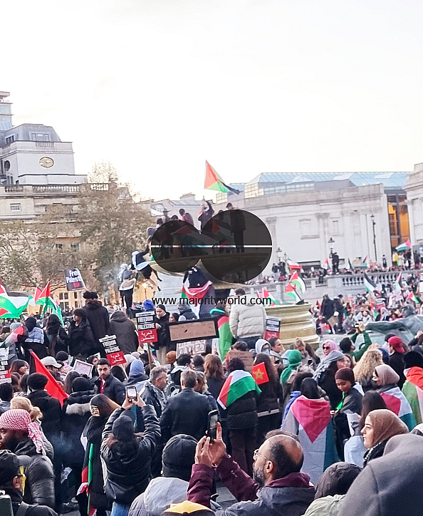 Thousands of protestors raise voices, carry placards and show their support for Palestinians, at Trafalgar Square, central London. United Kingdom.