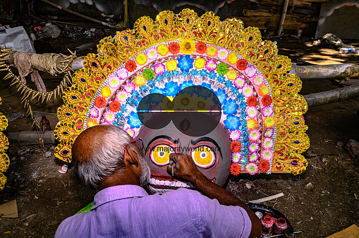 A village idol artist makes large color masks modeled after Purulia Chhau dance masks (Purulia Chhau dance is listed on UNESCO's World Heritage list of dances) of goddesses, animals, and rakshasas (humanoid demons or unrighteous spirits) like Hindu mythol