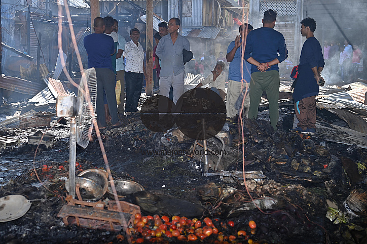 Shop owners and vendors are seen in front of their burnt shops and vegetables stalls in Battala market, the second biggest market in Tripura. A massive fire broke out at the Battala market which destroyed 155 shops. The estimated loss is expected to excee