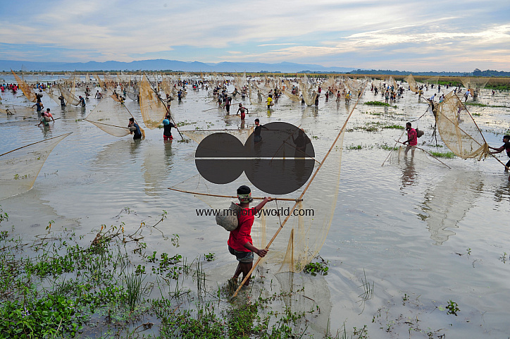• Description: Rural people armed with Bamboo fish traps and nets take part in celebrating a 200-year winter fishing festival at the jofra beel of gasbari union of Kanaighat upazila of Sylhet, Bangladesh.