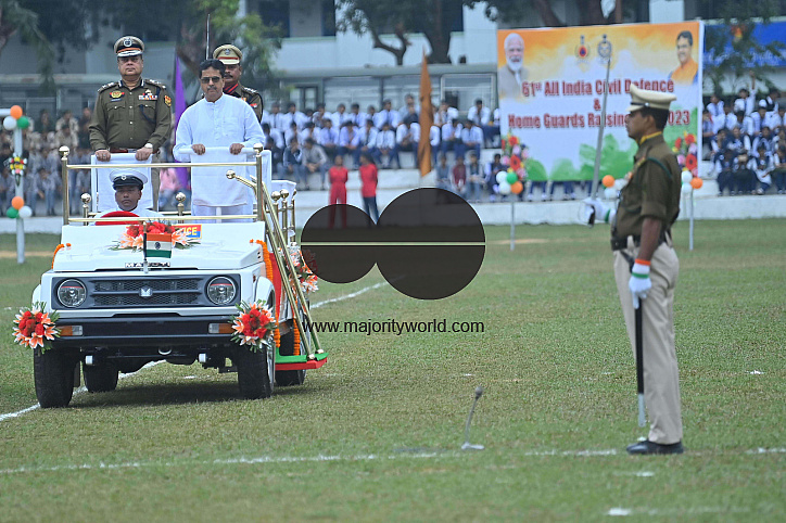 Tripura CM Dr. Manik Saha inspects the parade by the NDRF, Home Guards and Civil Defence troops on the occasion of 61st All India Civil Defence and Home guards raising day at the police parade ground in Agartala. Tripura, India.