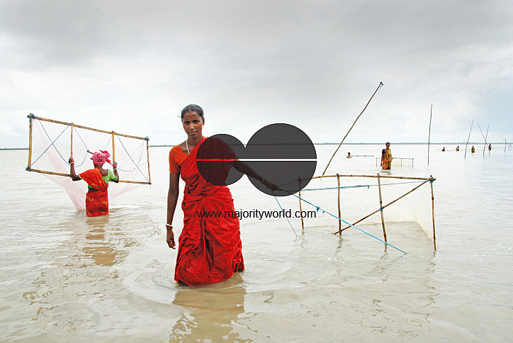 Women collecting prawn seeds from the saline river of Sundarban delta. Poverty prevails among the villagers that about 60,000 families go into chest-high waters of the rivers of Sundarbans regularly in search of prawn seeds (Bagda), where they often fall prey to shark bites and catch skin diseases. Life in the Sundarbans, the largest delta in the world, is all about the struggle for survival, be it for food, shelter or for sheer escape from man-eaters. Gosaba, Sundarban, West Bengal, India.