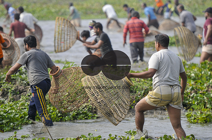 • Description: Rural people armed with Bamboo fish traps and handmade fishing nets take part in celebrating in a 100-year winter polo bawa fishing festival at the Gowahori beel of Biswanath upazila in Sylhet. Locals said the festival is celebrated every year at the 1st day of the Bangla month of Poush and apart from the locals, people from different parts of the Upozila gather at the beel with different kinds of fishing traps to partake in it. Sylhet, Bangladesh.