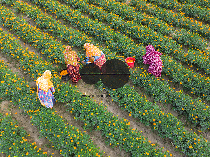 Farmers collect marigold flowers in Godkhali Union of Jessore, Bangladesh.