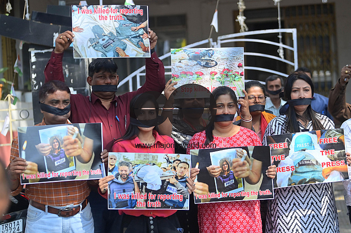 • Image Description: Agartala. Tripur, India. 26th February 2024. Journalists from print and electronic media carried placards and wore black cloth tied on their mouths in a silent protest against the killing of journalist in Palestinian on International Day in support of Pal