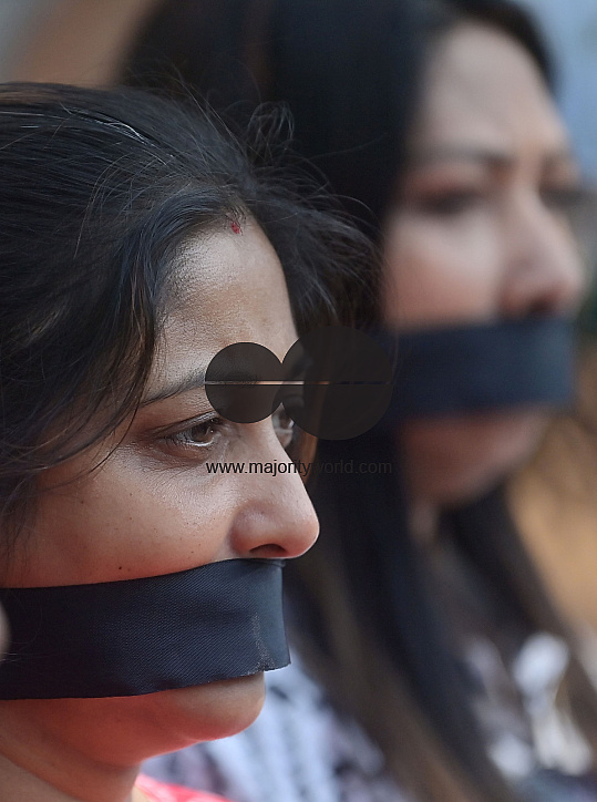 • Image Description: Agartala. Tripur, India. 26th February 2024. Journalists from print and electronic media carried placards and wore black cloth tied on their mouths in a silent protest against the killing of journalist in Palestinian on International Day in support of Pal