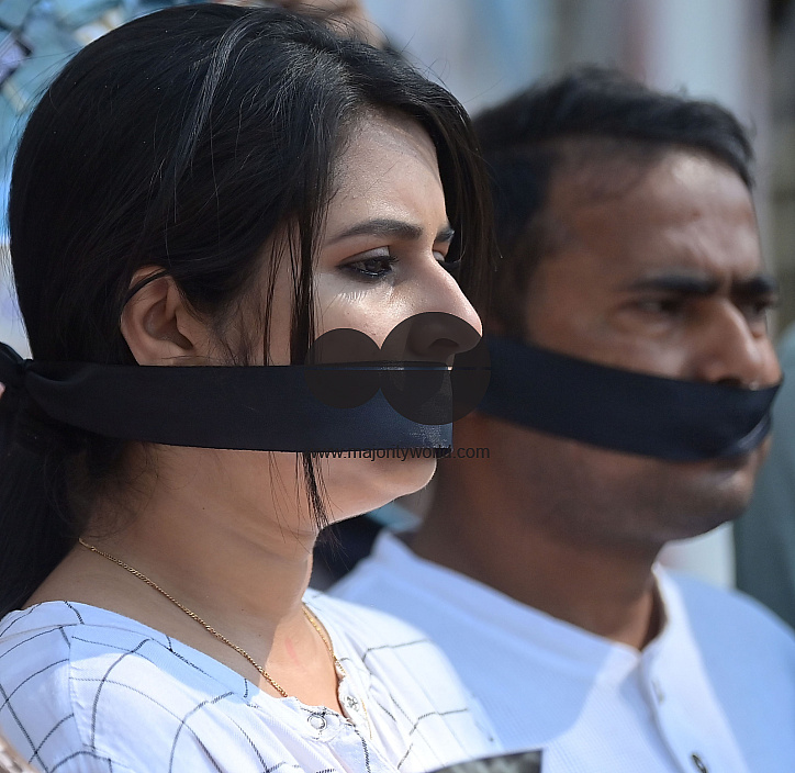 • Image Description: Agartala. Tripur, India. 26th February 2024. Journalists from print and electronic media carried placards and wore black cloth tied on their mouths in a silent protest against the killing of journalist in Palestinian on International Day in support of Pal