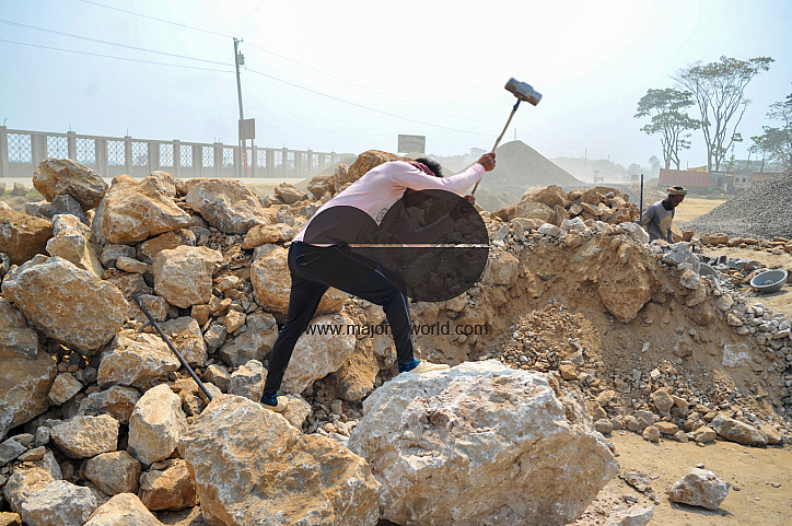 • Description: Male and female workers are breaking LC stones with a crusher machine in Bholaganj area, known as the 'Stone State' of Sylhet Companyganj Upazila. These workers whose health is at risk, earn 500-600 taka at the end of the day. Around 2000 workers are employed in more than two hundred crusher machines, and stones worth 3-5 crore rupees are broken every day. Sylhet-Bangladesh.