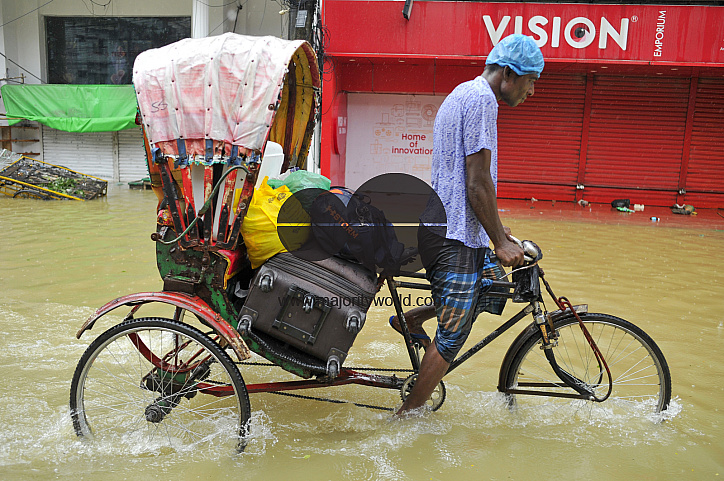 • Image Description: 19th June 2024. Sylhet, Bangladesh. Residents of the elite residential area of ​​Shahjal Upashahar of Sylhet are moving in rickshaws and rickshaw vans on flooded roads. As the flood situation worsened in Sylhet city, many people in Upashahar residential a